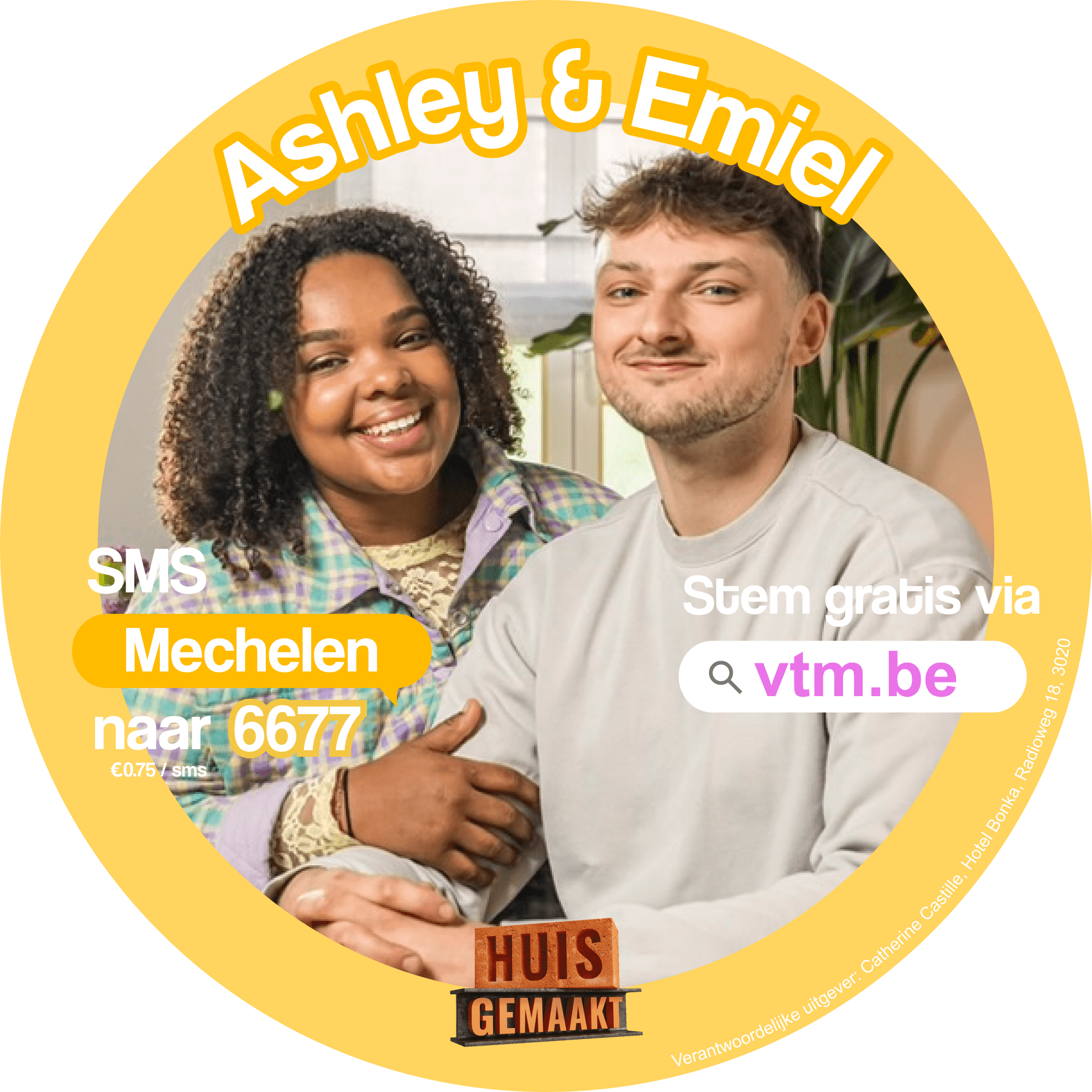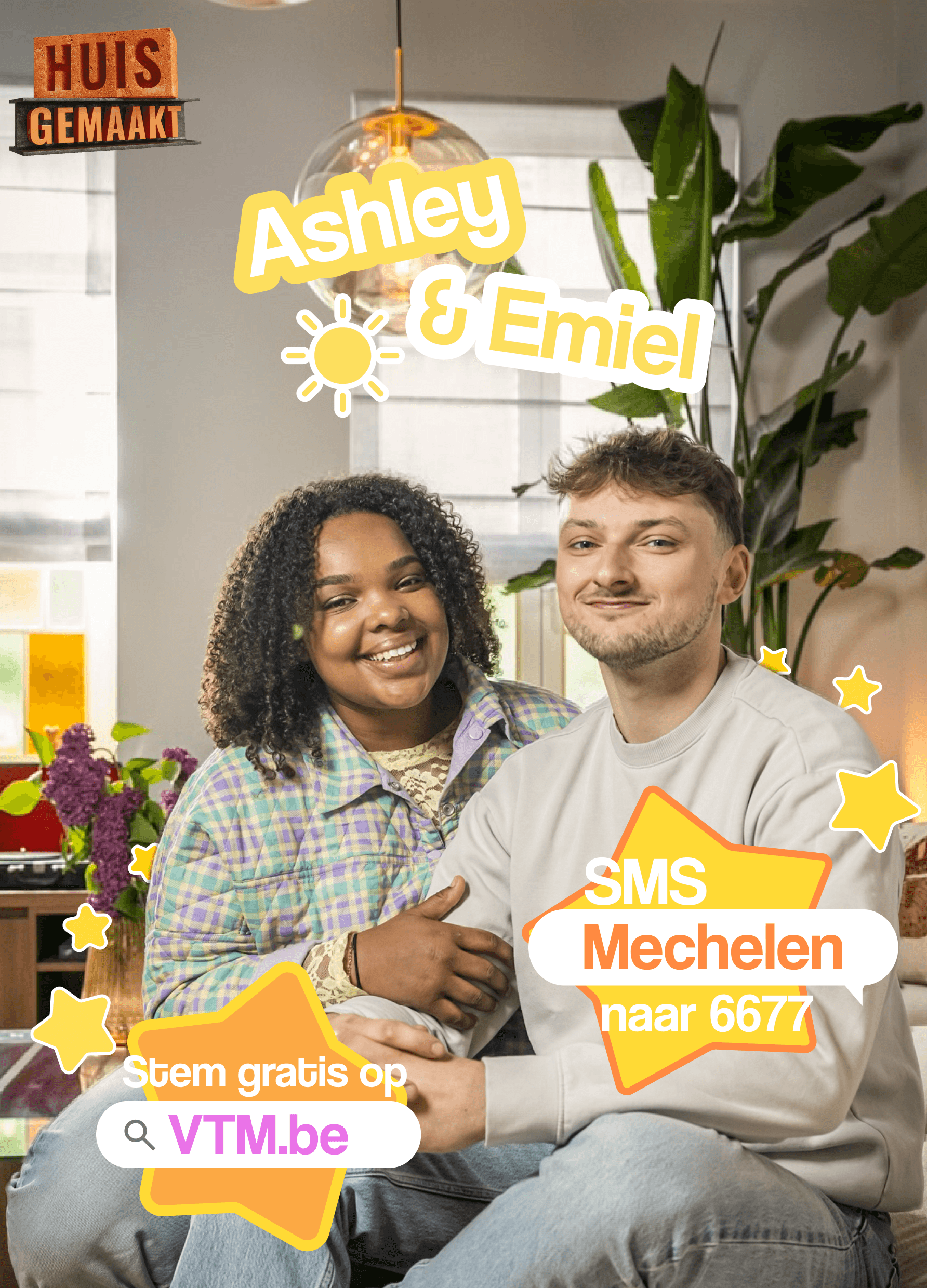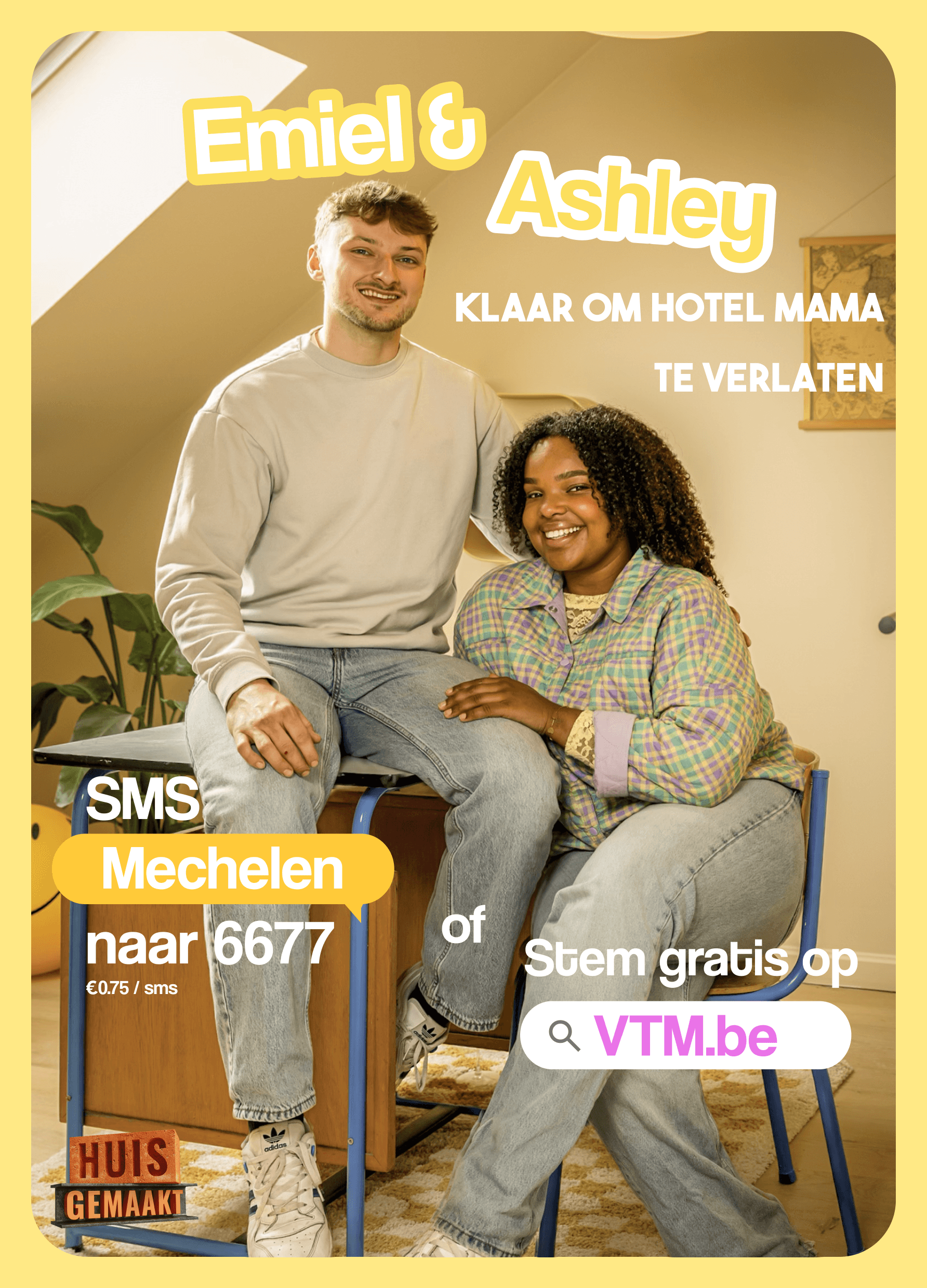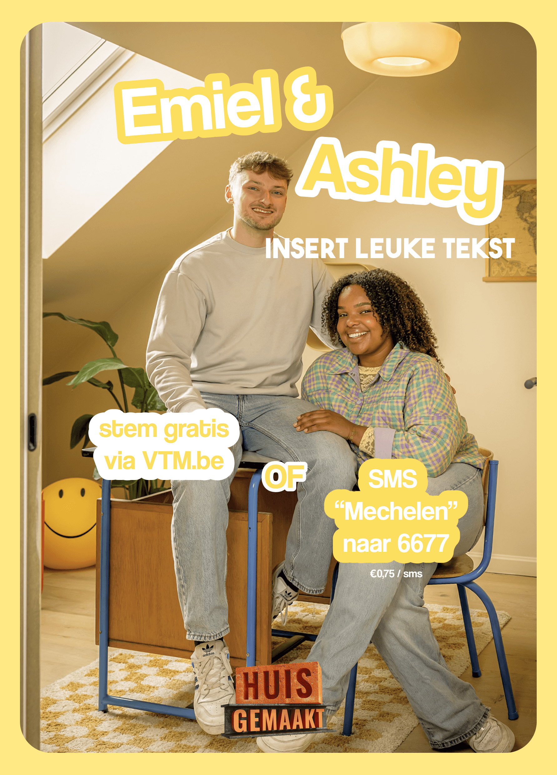 When Ashley and Emiel made it to the finals of Huis Gemaakt, they needed campaign materials fast. Three days to design a poster, flyer and sticker set that matched their energy, worked with their photoshoot, and could drive votes from the public.