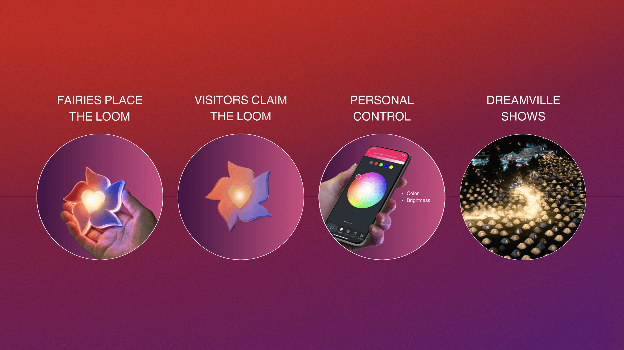 The experience runs across the full festival journey: a packing app with eco-friendly tent suggestions before arrival, Light Fairies placing Looms on-site during the weekend, and on Sunday night, all collected Looms lighting up the Dreamville campsite in one final show.