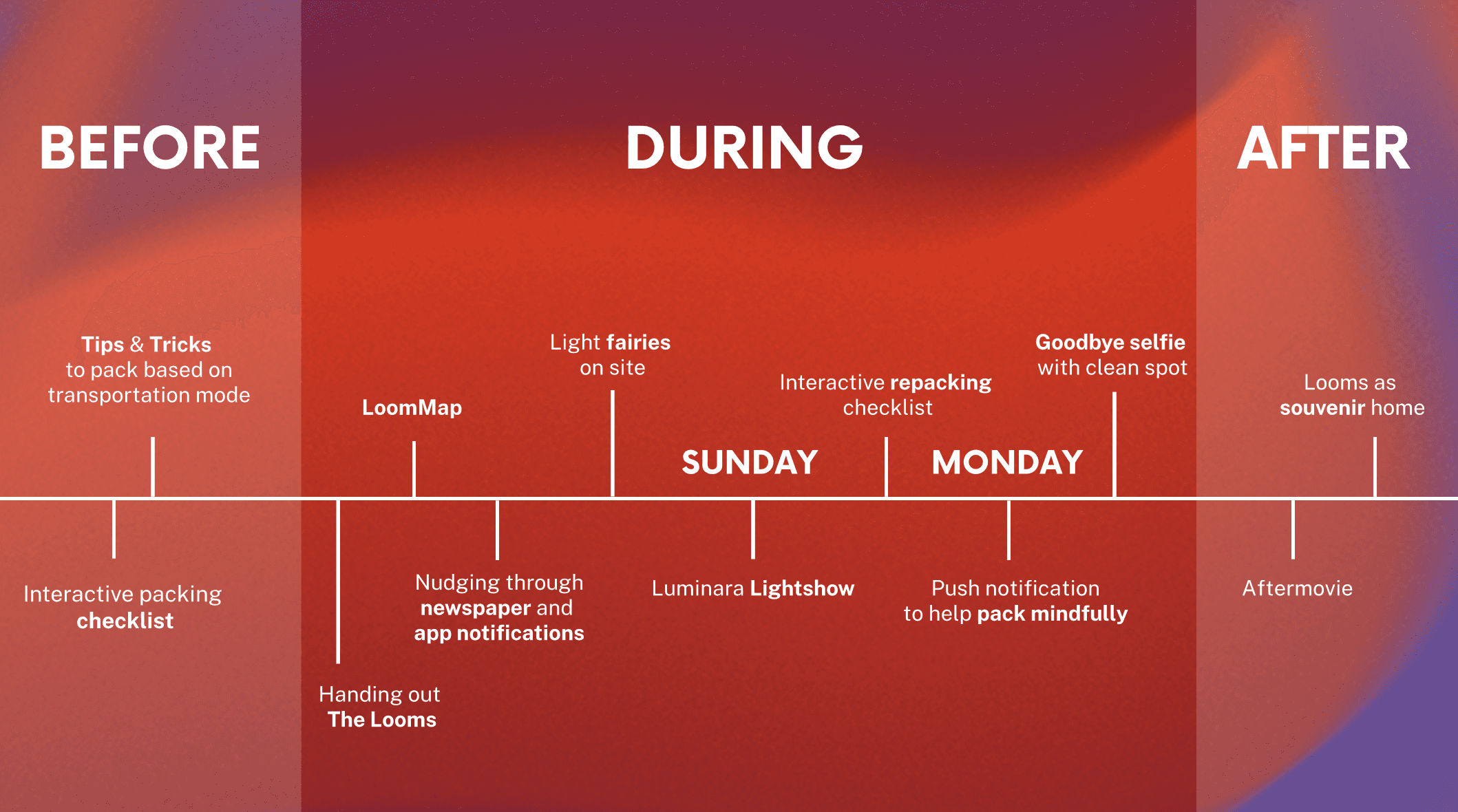 We designed a system built around a physical object called "a Loom": a small glowing light distributed by on-site fairies to tent areas that are kept clean and tidy. The Loom is a token of appreciation, a souvenir, and a nudge all at once. Visitors who receive one are reminded that their choices leave a trace, but that it can be a positive one.